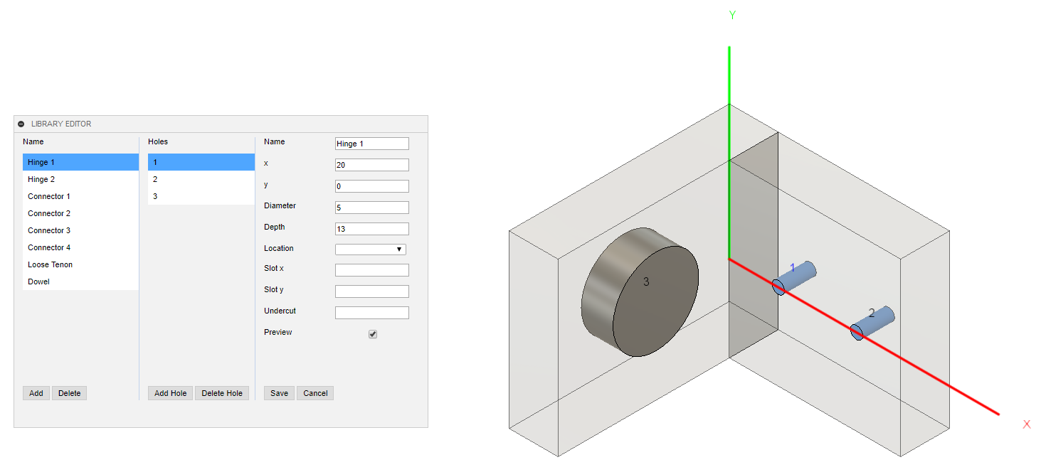 Hinge Holes add-in creates holes for hinges, connectors and drawers in a cabinet. This add-in allows you to specify hole dimensions, offsets and number of hinges. Dimensions of holes are saved in a library. It is particularly useful in woodworking.