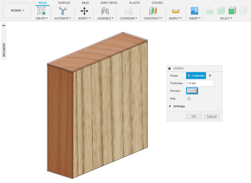 Veneer creates veneer for panels in a cabinet. This add-in allows you to specify the thickness and location of veneer. It is particularly useful in woodworking.