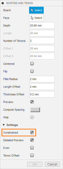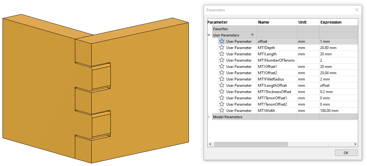 Mortise and tenon created with the checked Constrained checkbox (view 1) can be modified in the Parameters table (views 2 and 3).