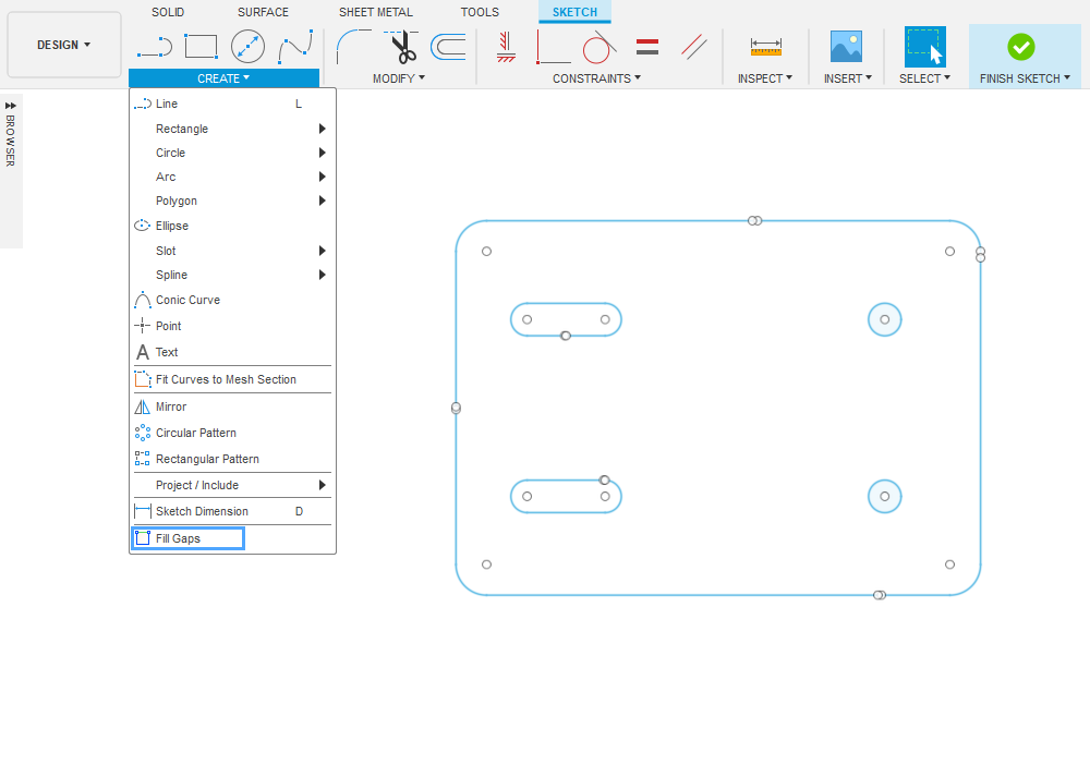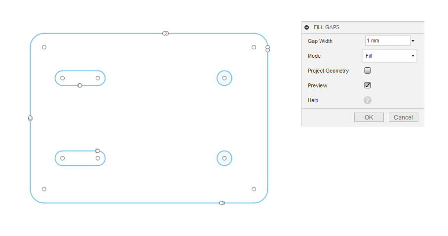 Fill Gaps in Sketch add-in scans a sketch and attempts to detect and fill gaps between endpoints of lines and curves in the sketch. It is particularly useful in an imported woodworking sketch geometry (see Fill Gaps Help).