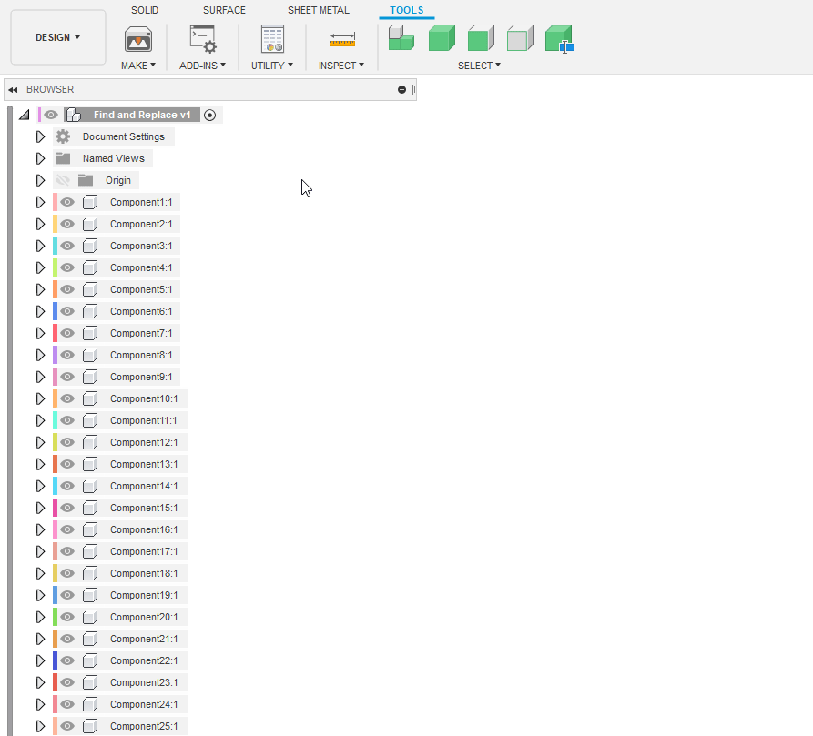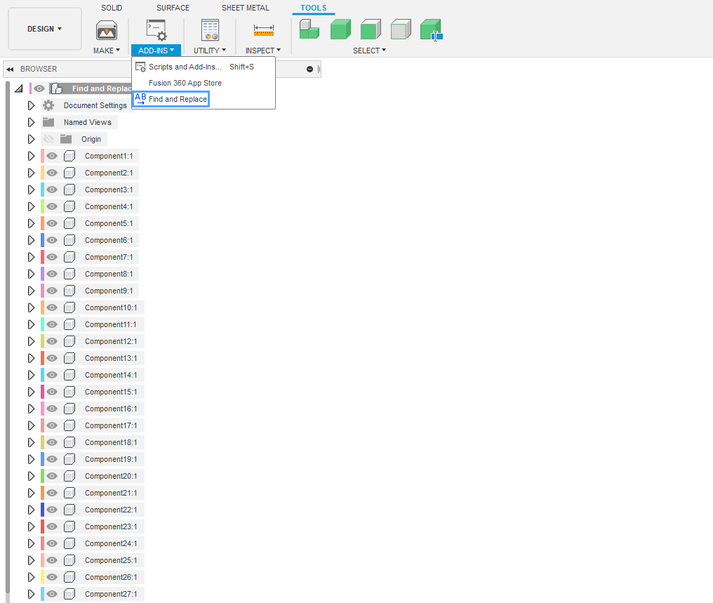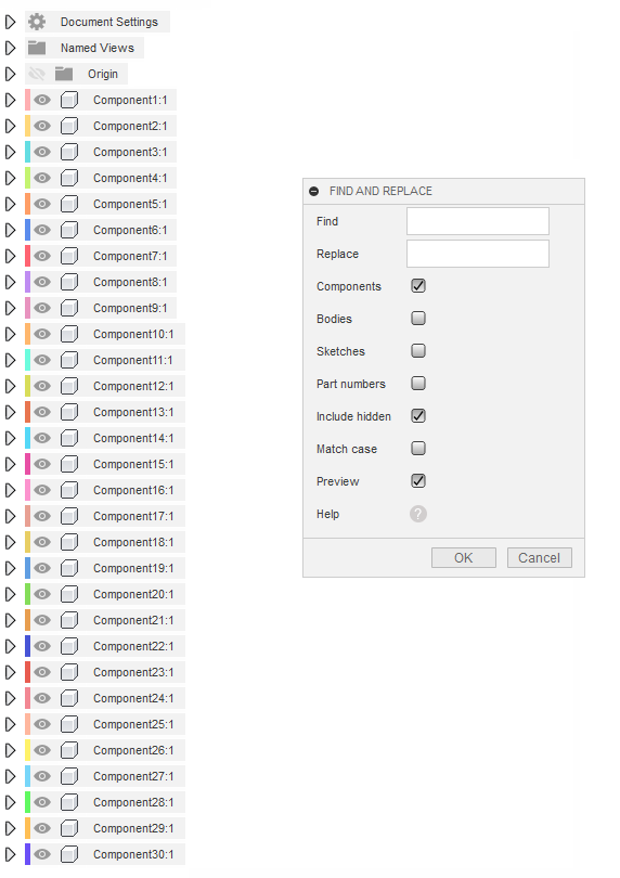 Find and Replace add-in finds and replaces text in names of components, bodies, sketches or part numbers. This add-in allows you to specify text to find and replace. It has options to include components, bodies, sketches, part numbers, hidden entities, and match case.