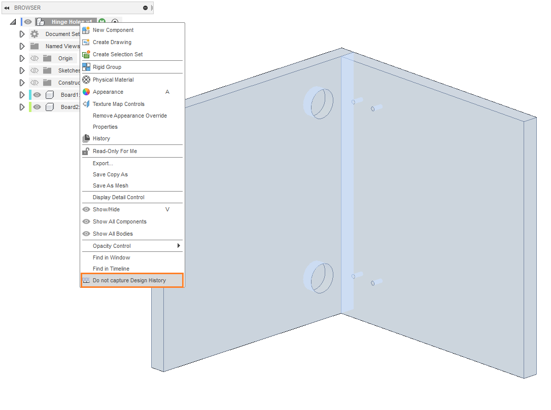 1. Right-click on the root component in the browser. Select Do not capture Design History (see view 1).