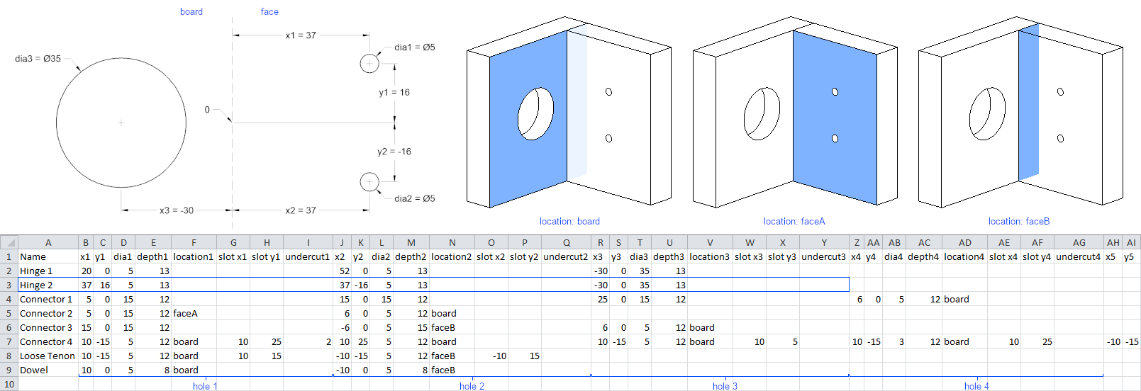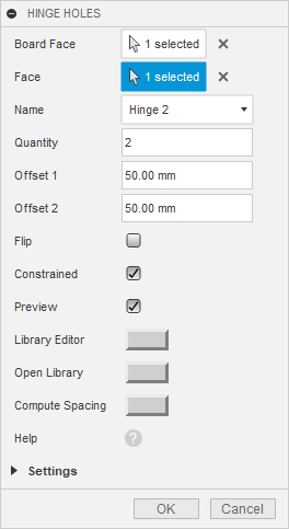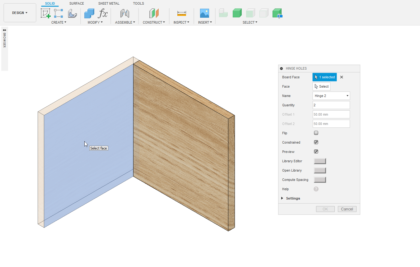 Hinge Holes add-in creates holes for hinges, connectors and drawers in a cabinet. This add-in allows you to specify hole dimensions, offsets and number of hinges. Dimensions of holes are saved in a library. It is particularly useful in woodworking.