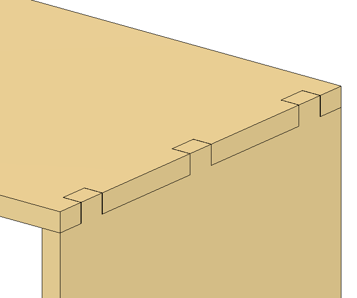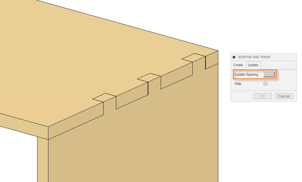 Mortise and tenon created with the checked Constrained checkbox (view 1) can be updated with the Update Spacing button. To update the mortise and tenon after changing the width of the board, press the UpdateSpacing button (view 2).