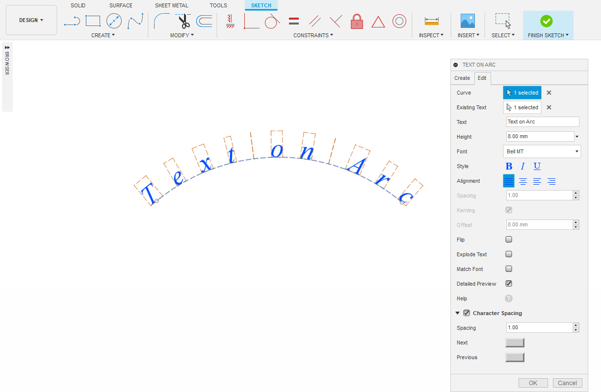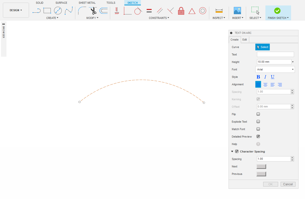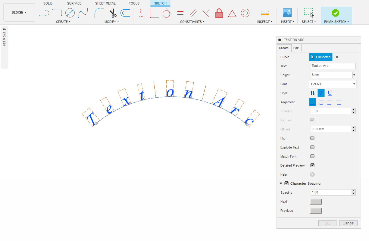 Text on Arc add-in creates a sketch text on the selected arc, spline, elliptical arc, conical curve, circle, ellipse or line. This add-in allows you to specify the arc, text, font name, font height, font style, alignment, spacing, offset, kerning, and side of the arc. It has an option to break the text into profiles, and an option to edit an existing text on arc.