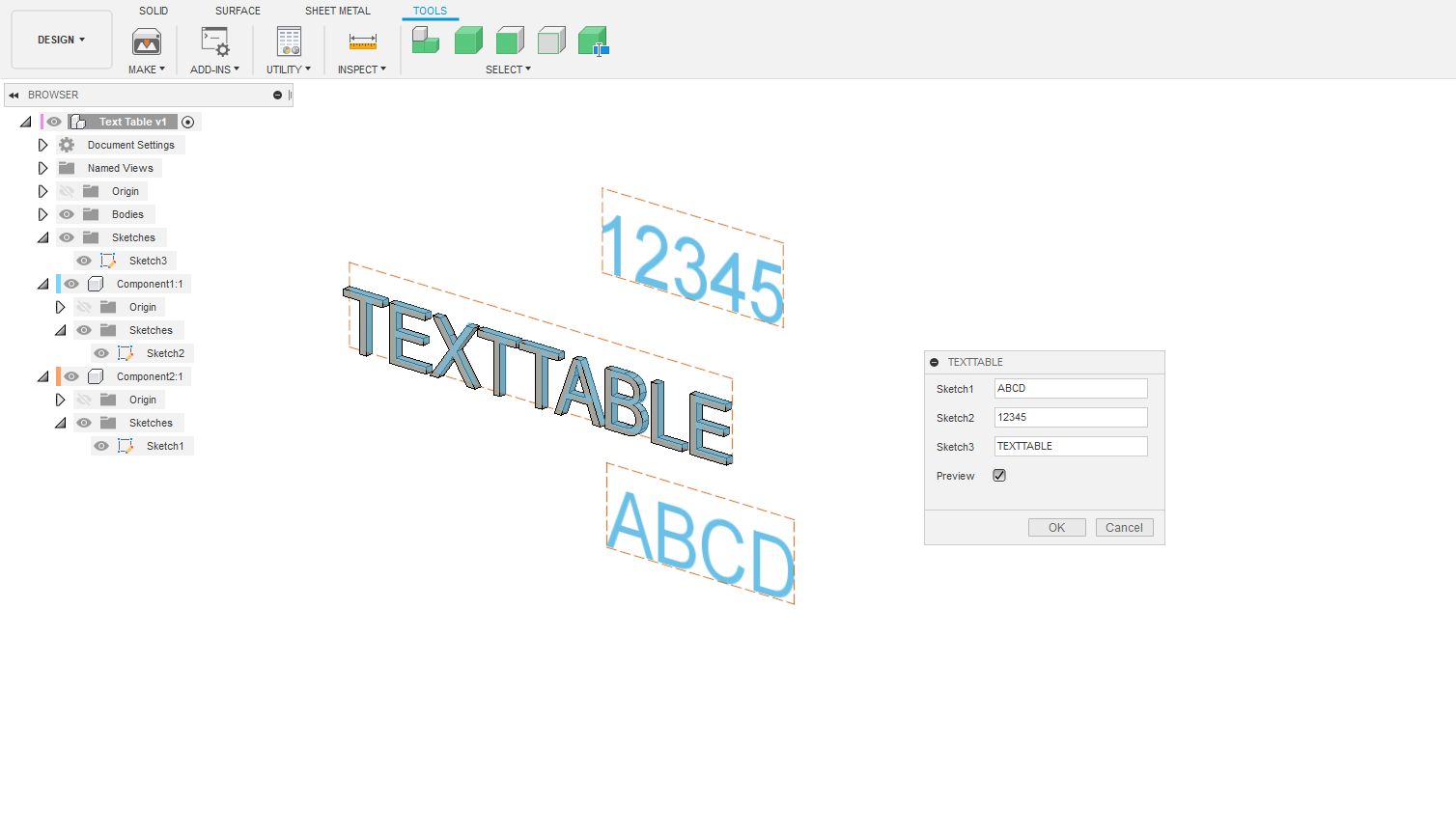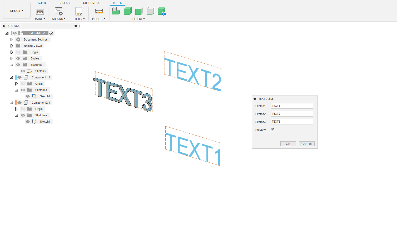Text Table add-in allows the user to edit all sketch texts in the active design from the add-in window. It is particularly useful in designs with many sketch texts.